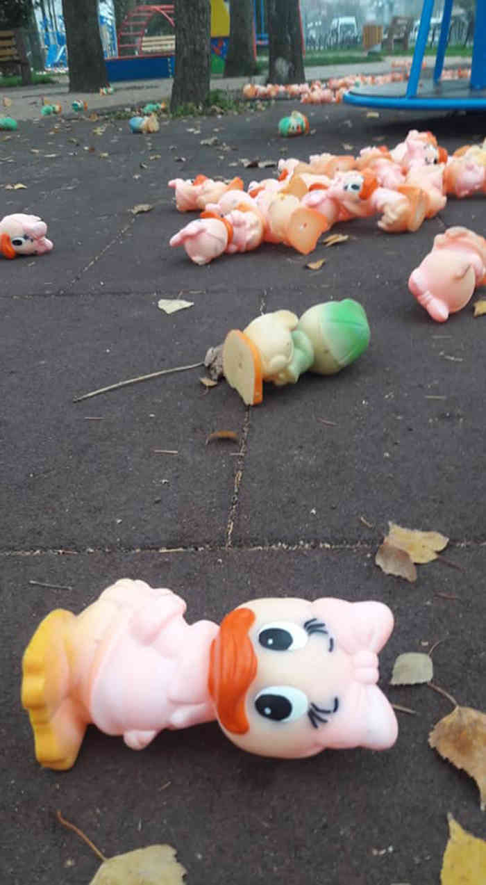 Сьогодні, 5 листопада, уранці перехожі, що йшли на роботу чи по справам проспектом Космонавтів, були здивовані побаченим: біля ігрового майданчика невідомі розкидали сотні, а може й тисячі іграшок.