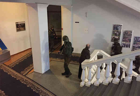 Саме у цей час за легендою зловмисник з гранатою захопив заручників у сесійній залі та погрожував усіх підірвати. Співробітники «Альфи» знешкодили умовного терориста, а бійці ДСНС забезпечити тушіння полум’я. Нацполіція та Нацгвардія відпрацювала методи протидії захопленню будівлі ззовні.