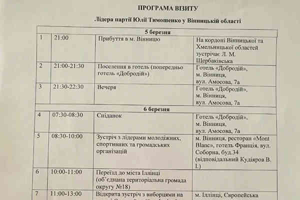 Але нині насправді брифінг навіть не був присутнім у затвердженому графіку перебування Тимошенко на Вінниччині. NaПарижі вдалося отримати документ, в якому розписано все по годинам.