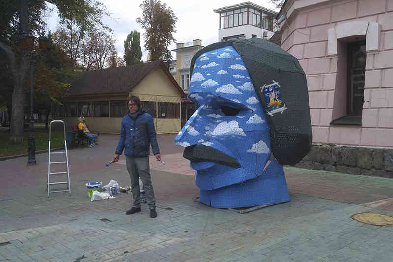 «Синій колір відповідає назві фестивалю. «Air»- це повітря. Якщо у Дніпрі, де проводився фестиваль, місцеві художники надали голові сріблястий колір з малюнками місцевих об’єктів, то ми пішли іншим шляхом. Гоголь, мабуть, був першим сюрреалістом і метафізиком, тому розмалювали його у стилі Рене Маґрітта», - пояснив NaПарижі О. Нікітюк.