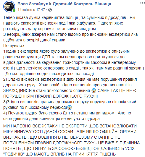 "Експерт й сам неодноразово притягувався до відповідальності за керування транспортним засобом в нетверезому стані (що з легкістю оспорював в судді, так як і там має родинні зв'язки)", - пише В.Затайдух.