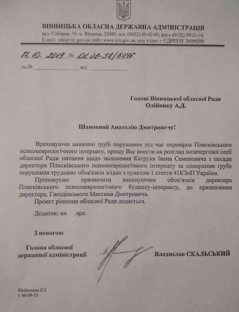 З інсайдерських джерел в облраді виданню вдалося дістати документи, які вказують на те, що у той же день, коли Р. Імереллі і NaПарижі написали о порушеннях, голова Вінницької ОДА Владислав Скальський звернувся з листом до голови Вінницької облради А. Олійника, де, враховуючи «грубі порушення», попросив винести на розгляд позачергової сесії питання щодо звільнення І. Катрука згідно з п.1 ст.41 КЗпПУ, а також додав проєкт рішення.