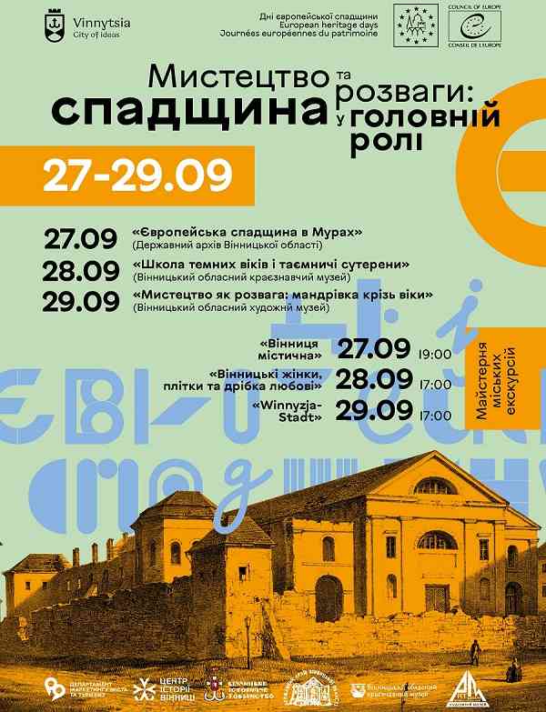 27-29 вересня у Вінниці вперше проведуть Дня європейської спадщини. Це – традиційна спільна ініціатива Ради Європи та Європейської Комісії. Проводять заходи такого плану у переважній більшості європейських країн. Цьогорічна їхня тематика - «Мистецтво та розваги: спадщина у головній ролі». Як зазначають на сайті міської ради, вінничани зможуть відвідати інтерактивні виставки, отримати доступ до закритих об'єктів, а також побувати на презентаціях нових унікальних екскурсійних маршрутів.