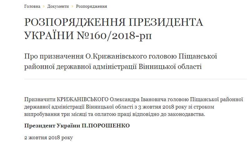 У Піщанському районі кадрові зміні, відсьогодні головою місцевої райдержадміністрації призначено Олександра Крижанівського. Відповідне розпорядження 2 жовтня підписав глава держави Петро Порошенко. При цьому президент дав новому керівнику три місяці випробувального терміну.