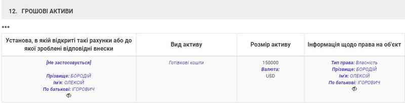 У декларації депутата за березень 2019-го значиться, що в нього є готівкові кошти у розмірі 150 тисяч доларів.