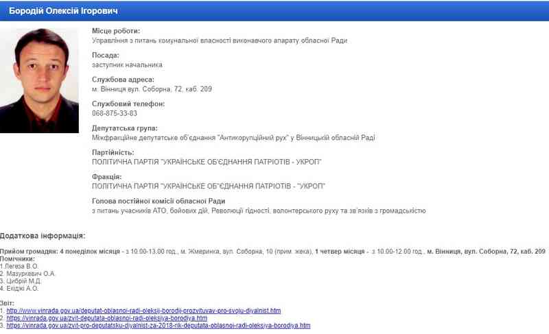 Зазначимо, що мова йде про Олексія Бородія. Він працює заступником начальника управління з питань комунальної власності виконавчого апарату облради. Олексій Ігорович був обраний депутатом від партії УКРОП, входить до однойменної фракції, а також до міжфракційного депутатського об’єднання «Антикорупційний рух» у Вінницькій обласній Раді. Також він є головою постійної комісії облради з питань учасників АТО, бойових дій, Революції гідності, волонтерського руху та зв’язків з громадськістю.