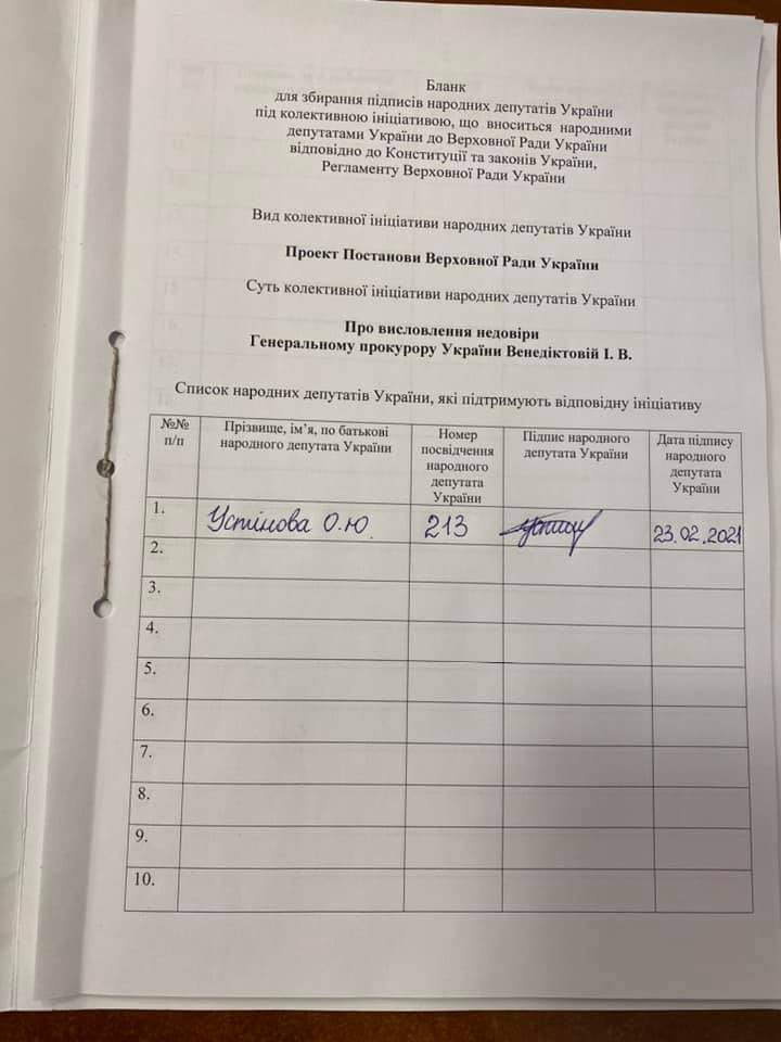 "Голос" починає збір підписів за відставку Генпрокурорки Ірини Венедіктової. Саме прокурори Венедіктової та кишеньковий суддя з бюстами Лєніна і Сталіна сьогодні добилися першоі політичної посадки і запроторили за грати Сергія Стерненка", - написала у Facebook О.Устінова, навівши скан документу зі своїм підписом.