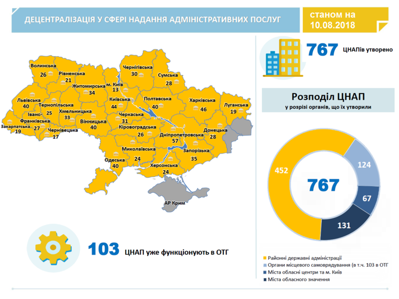 Більш красномовною є створена мережа центрів наданням адмінпослуг (ЦНАП). На Вінниччині вона налічує 36 установ та 6 філій. Завдяки появі такого центру неподалік населеного пункту людям не потрібно їздити «до міста», адже значну кількість питань вони можуть вирішувати поруч з власним будинком.