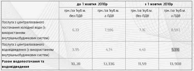 З урахуванням нових «викликів» у НКРЕКУ не стали відкладати з «відповіддю» і ще 4 вересня погодили тарифи на цей рік. Вони вступають в силу з 1 жовтня. Як вказується на офіційному сайті підприємства, послуга з централізованого водопостачання з використанням внутрішньобудинкових мереж зросте з нинішніх 7,596 до 8,592, грн./м3 (з ПДВ), а послуга з водовідведення - з 4,74 до 5,316 грн./м3 (з ПДВ). Таким чином, сумарно за використаний куб води при холодному водопостачанні та водовідведенні городянам доведеться з наступного місяця платити 13,908 грн. Це не набагато більше «вересневих» 12,336.