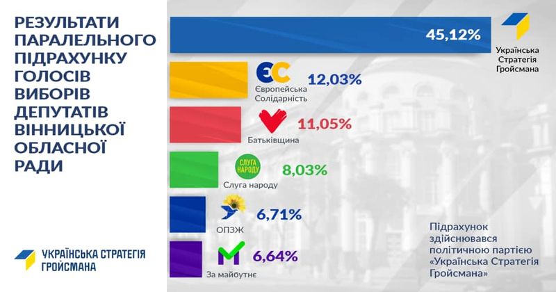 Як зазначають на сторінці партії у Facebook, триває паралельний підрахунок голосів по виборах депутатів Вінницької облради. За його даними, політична сила одержала безпрецедентно високий рівень підтримки виборців.