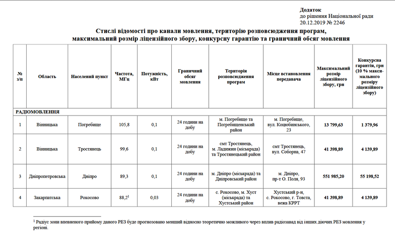 Загалом на конкурс виставлено 29 FM-частот у 14 областях України. Заяви від мовників прийматимуться із 3 лютого до 3 березня за адресою: вул. Прорізна, 2, м. Київ. Переможців планують оголосити до 1 травня.