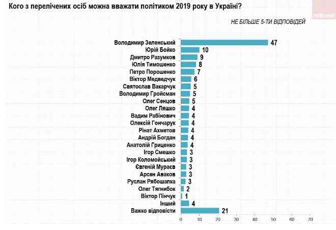 На другому місці лідер проросійської ОПЗЖ Юрій Бойко (10%), третій - спікер ВР і соратник Зеленського Дмитро Разумков (9%). Лідерку «Батьківщини» Юлію Тимошенко «політиком року» назвали 8% респондентів, п’ятого президента Петра Порошенка – 7%, а одного з очільників ОПЗЖ, кума Путіна Віктора Медведчука – 6%.