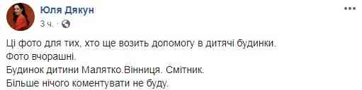 Вінничанка Юлія Дякун, волонтер БО «Благодійний фонд «Ми поруч», написала у Facebook проте, що побачила 19 січня, а саме купи дитячих іграшок біля смітнику поруч з будинком дитини «Малятко». За перші п’ять годин повідомлення жінки перепостили 7,5 тисяч разів, а за менш ніж добу - 18 тисяч.