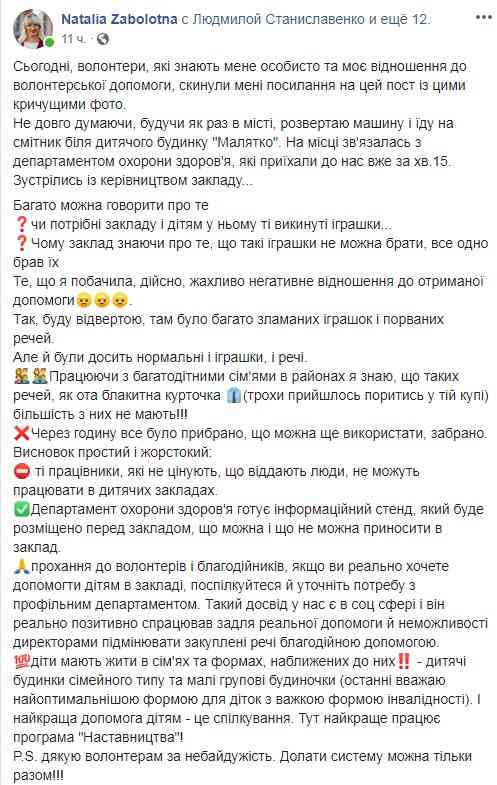"Прохання до волонтерів і благодійників, якщо ви реально хочете допомогти дітям в закладі, поспілкуйтеся й уточніть потребу з профільним департаментом. Такий досвід у нас є в соцсфері і він реально позитивно спрацював задля реальної допомоги й неможливості директорами підмінювати закуплені речі благодійною допомогою", - прокоментувала ситуацію у Facebook заступниці голови Вінницької ОДА Наталія Заболотна.