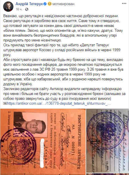 Народний депутат від «Народного фронту» 8 скликання Андрій Тетерук спростовує викладений виданням «Антикор» матеріал про нібито те, що він у складі російських військ приймав участь у штурмі аеропорту Пріштіни, нинішньої столиці Косово. Вінничанин пояснює, що звільнився з лав ЗСУ РФ у травні 1999-го, а захоплення летовища відбувалося у червні.