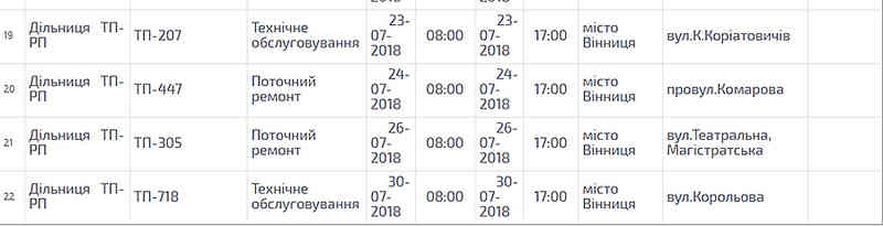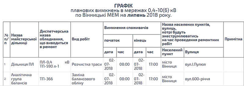 Енергетики заздалегідь попереджають мешканців Вінниччини про планові ремонтні роботи й розчистку електроліній, через що їм доводиться тимчасово припиняти подачу електроенергії. Зокрема, й протягом липня у Вінниці мешканцям деяких вулиць доведеться якийсь час обходитися без світла. Час імовірних відключень – з 8:00 до 17:00.