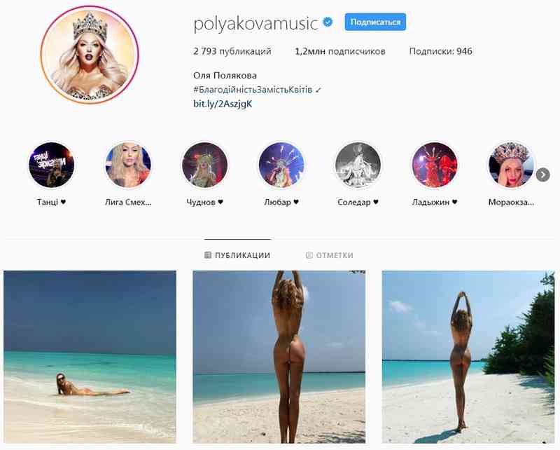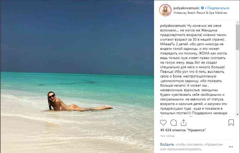 Колишня вінничанка, а нині зірка естради та телеведуча Оля Полякова відпустку на Мальдівських островах вирішила провести «з користю». В Instagram епатажна співачка виклала кілька світлин, на яких повністю оголена. Вона пояснила, що одяг інколи зайвий, адже не соромиться свого тіла. Цими фото діва хотіла підтримати челендж «труси для трусів».