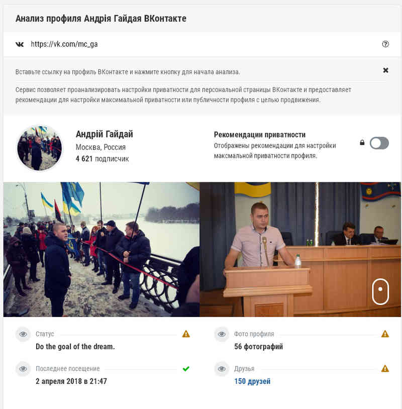 «Родзинкою» вивчення вподобань Андрія Гайдая стало інше. Він настільки зневажає президента Порошенка та РНБО, що нехтує рішенням, яке введено в дію 16 травня 2017-го, про санкції щодо російських соціальних мереж. Хлопець дотепер є активним користувачем «ВКонтакте». Більш того, щодня відвідує цю мережу. Так, звісно, мережа сприймає його як жителя Москви.