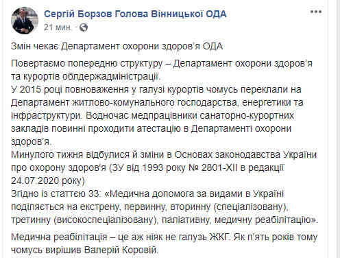 У Facebook очільник Вінниччини Сергій Борзов написав про те, що повертає попередню структуру – «департамент охорони здоров’я та курортів ОДА». Він має змінити нинішній «департамент охорони здоров’я». Більш того, реорганізація передбачає призначення нового керівника за спрощеною процедурою. І саме у той час, коли очільниця депаратменту на лікарняному не через тиск чи «серце», а планове оперативне втручання. Про що губернатор не написав.