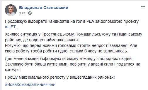 «Хвилює ситуація у Тростянецькому, Томашпільському та Піщанському районах, де подано найменше заявок. Розумію, що перед новими головами стоять непрості завдання. Але свою роботу треба робити гідно, скільки б часу не залишилось. Для мене важливо сформувати якісну команду з порядних людей. Закликаю бути більш активними, повірити у власні сили і податися на конкурс», - пише В.Скальський. Він закликає максимально поширювати цей допис у згаданих районах.