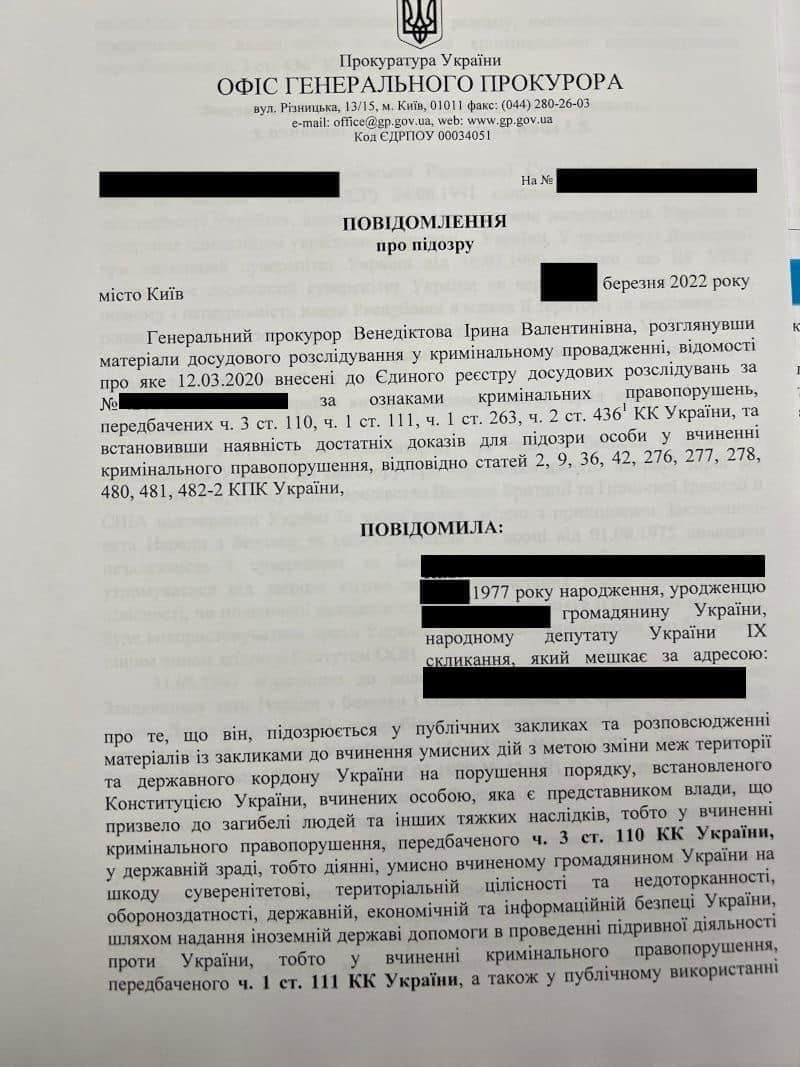 Як повідомляє Центр стратегічних комунікацій та інформаційної безпеки, одіозному депутату Іллі Киві висунуто підозру у держзраді та закликах до зазіхання на територіальну цілісність України.
