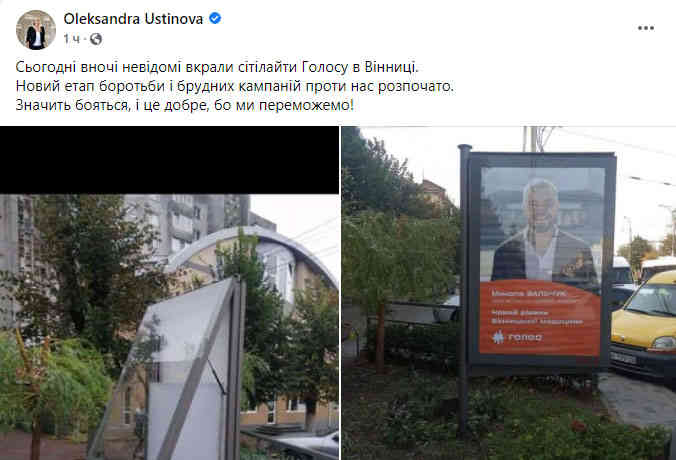 Народна депутатка від «Голосу» та кандидатка в мери Вінниці Олександра Устінова у Facebook написала про крадіжку політичної агітації. За її словами, вночі невідомі викрали плакат із кандидатом від політичної сили, яку вона представляє.