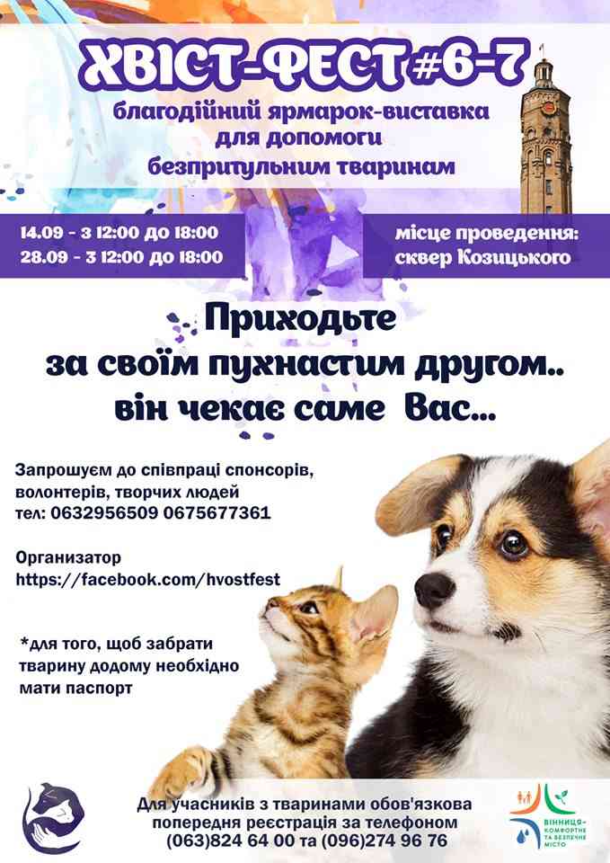 Згідно інформації, наданої у Вінницькій міській раді, 14 вересня на День міста о 14:00 у Вінниці пройде вже шостий ярмарок безпритульних тварин «Хвіст-фест». Захід традиційно відбудеться у сквері біля міської вежі, де волонтери безплатно віддаватимуть котів і собак у добрі руки.