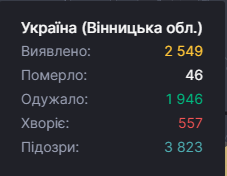 За час епідемії в області зафіксовано 46 летальних випадків. Одужало 1946 людей (20 - за добу). Загалом на Вінниччині з початку пандемії було виявлено 2 549 випадків хвороби.