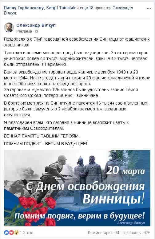 У Facebook на правах реклами шириться допис нардепа Олександра Вілкула, в якому він вітає з 74-ою річницею визволення Вінниці від фашистських загарбників. Колишній віце-прем’єр та соратник біглого президента Віктора Януковича пригадує енциклопедичні деталі окупації області та міста та кількість загиблих.