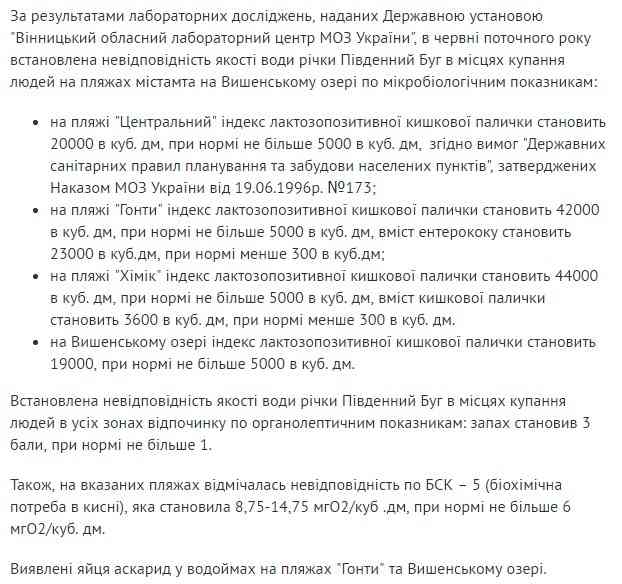 Враховуючі дані досліджень, у Вінницькому міському управлінні ГУ Держпродспоживслужби у Вінницькій області наголошують на забороні купання на пляжах Південного Бугу та у Вишенському озері.