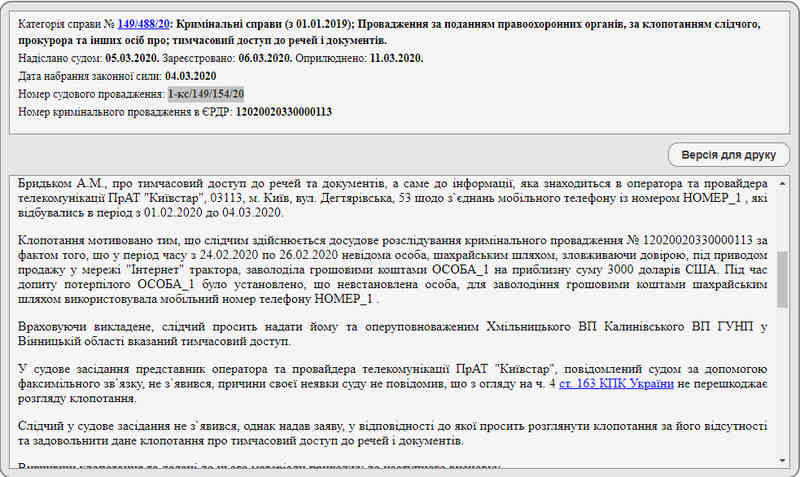 Згідно матеріалів Хмільницького міськрайонного суду Вінницької області, своїх жертв аферист шукав через оголошення, пропонуючи сільгосптехніку. На гачок попався фермер. Чоловік вирішив придбати потрібний в господарстві агрегат і перерахував злочинцеві всю суму на банківську карту.