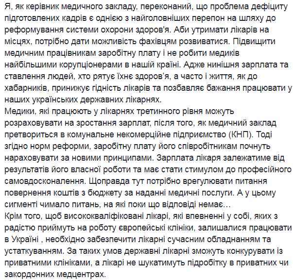 «Це працівники не пенсійного чи передпенсійного віку. Це молодь – амбітна, перспективна. Хтось знайшов роботу із гідною зарплатою у приватних клініках, чимало виїхали за кордон. Якщо нічого не змінювати, то ситуація буде лише погіршуватися. Щоправда, офіційно в Україні не рахують лікарів, які їдуть працювати закордон. В Міністерстві охорони здоров'я неодноразово зазначали, що офіційної статистики трудової міграції медпрацівників за кордон просто не існує. Однак нині, за різними даними експертів у вітчизняних лікарнях не вистачає майже третини медичного персоналу», - зазначив головний лікар онкоцентру.