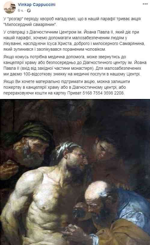 У Facebook зазначається, що в парафії триває акція «Милосердний самарянин». Наслідуючи Ісуса Христа, церковники у співпраці з діагностичним центром ім. Йоана Павла II хочуть допомогти малозабезпеченим людям у лікуванні. В кого є потреба, вони пропонують звертатися до канцелярії храму або безпосередньо до центру, розташованого поруч із костелом.