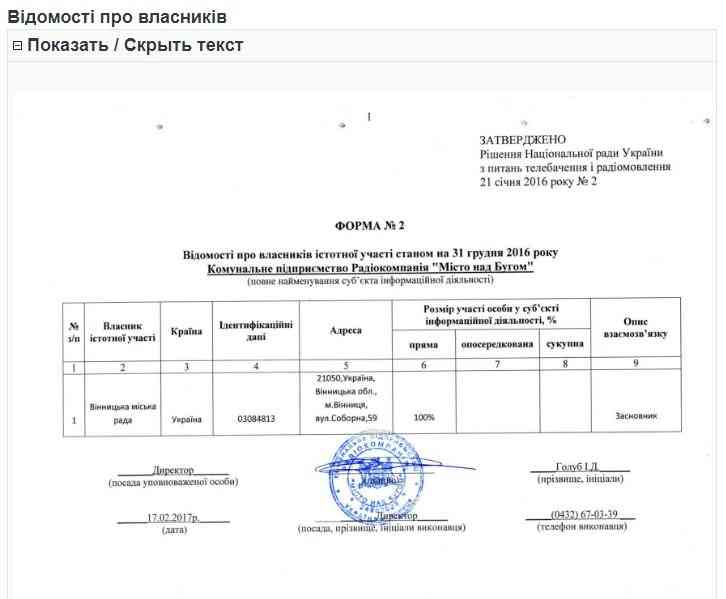 Так, на сайті комунального радіо «Місто над Бугом» є не просто вся необхідна інформація, контакти редакції, але і коротка довідка про журналістів, їхні контакти, документи редакції, де вказані засновники, фінансові звіти редакції. Сайт «Міста над Бугом» точно заслуговує на звання найпрозорішого сайту Вінниці у плані власності та відкритості.