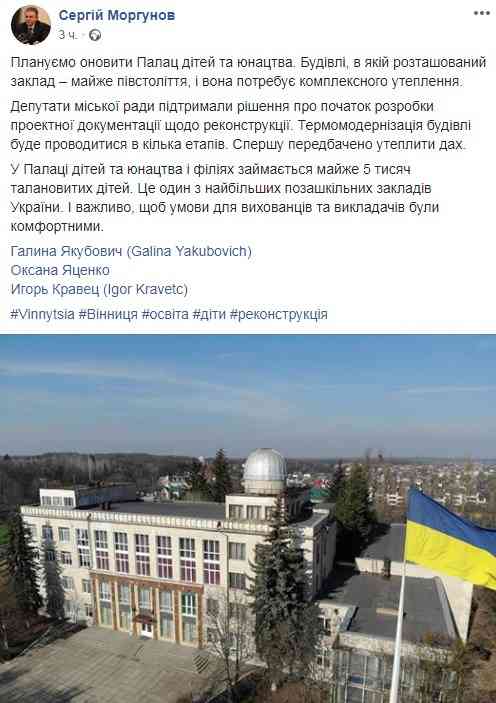 У найближчі роки з міського бюджету Вінниці будуть виділені кошти на реконструкцію і утеплення Палацу дітей та юнацтва, розташованого по Хмельницькому шосе. Це найбільший дитячий заклад міста за кількістю відвідувачів та розгалуженою мережею напрямків діяльності. Анонсував початок робіт в Facebook мер Вінниці Сергій Моргунов.