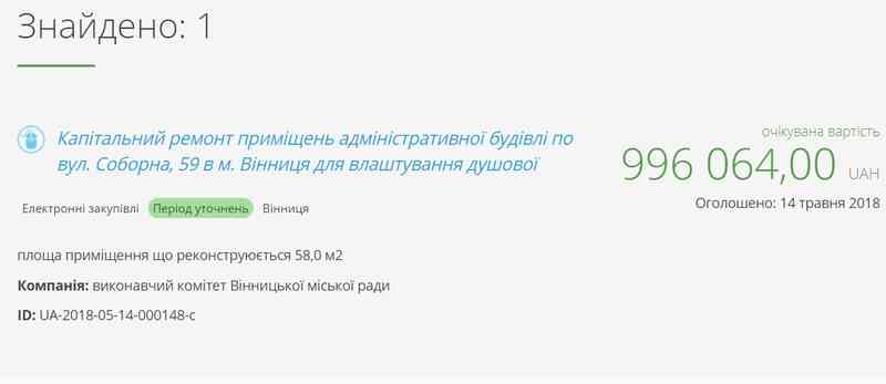Як стало відомо, виконком Вінницької міськради оголосив тендер на «Капітальний ремонт приміщень адміністративної будівлі по вул. Соборна, 59 в м. Вінниця для влаштування душової». Відповідне оголошення з'явилося учора на сайті публічних закупівель Prozorro.