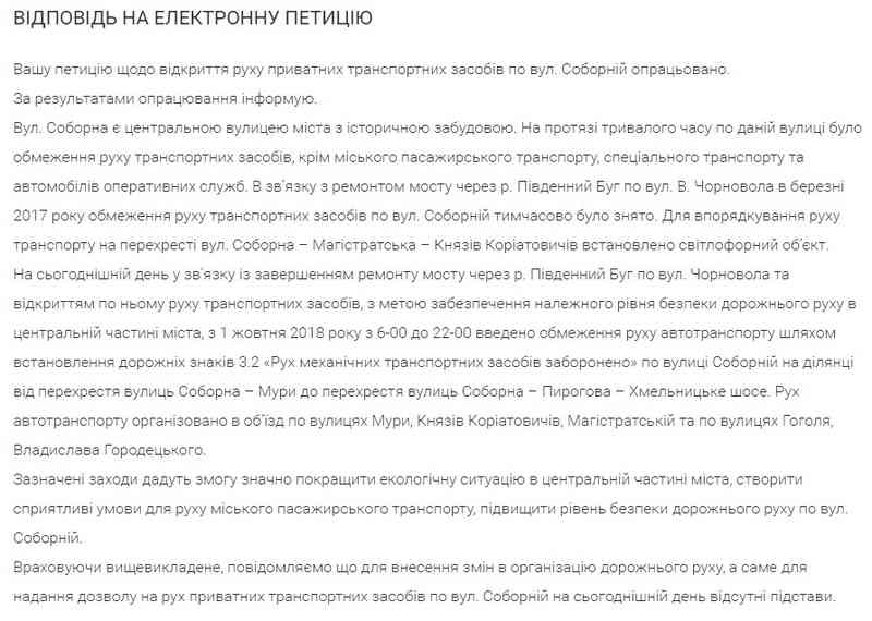 У мерії залишаються непохитними. Відповідаючи на петиції, міськрада зазначила, для «надання дозволу на рух» приватним транспортом відсутні підстави.