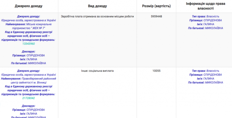 Як пояснив директор департаменту житлового господарства Вінницької міськради Роман Фурман, співробітниця ЖЕКу помилилася і надіслала відповідну заяву до НАЗК, але помилку донині не виправлено. Річна зарплатня Г. Спірідонової складає 59594, 48 грн.