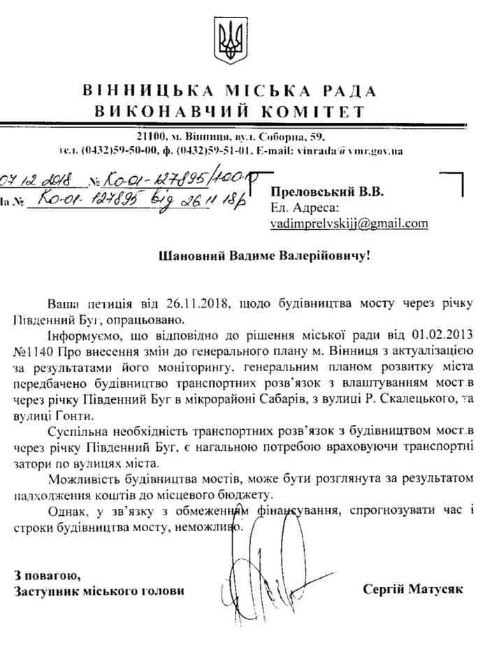 У відповіді на петицію у міськраді пояснили, що «суспільна необхідність транспортних розв’язок з будівництвом мостів» є «нагальною потребою», але «можливість будівництва» розглянуть при надходженні коштів до місцевого бюджету. Зважаючи на обмежене фінансування, як зазначають у мерії, «спрогнозувати час і строки будівництва» наразі неможливо. Відверто і чесно…