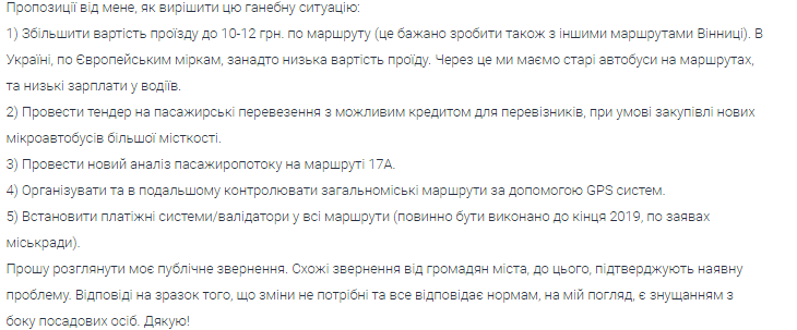 На сайті Вінницької мерії Олексій Музиченко зареєстрував петицію, в якій задля підвищення та покращення надання транспортних послуг пропонує збільшити вартість проїзду у маршрутках до 10-12 грн, зокрема і на маршруті №17А.
