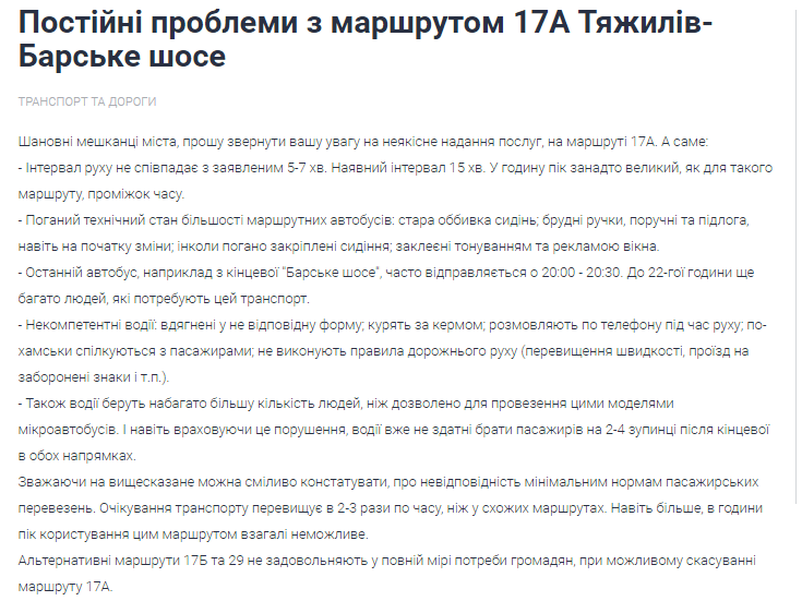 Свою пропозицію він мотивує неякісним наданням послуг на маршруті 17А. Його не влаштовує інтервал руху, який начебто не співпадає з заявленими 5-7 хв. Наявний інтервал - 15 хв. До того ж, на думку автора петиції, у більшості маршрутних автобусів поганий технічний стан.