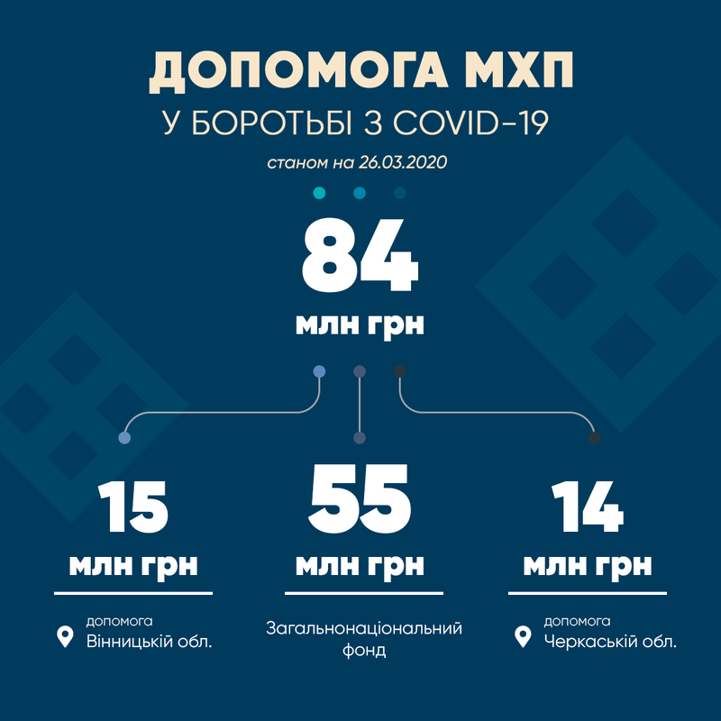 Фінансову допомогу було виділено в межах домовленостей між владою та представниками великого бізнесу, які було досягнуто під час зустрічі, організованої президентом 16 березня. Крім того, МХП взяв під опіку Вінницьку та Черкаську області, як регіони своєї найбільшої присутності. На їхні потреби холдингом було виділено 15 і 14 млн грн відповідно. Таким чином, на сьогодні компанія вже спрямувала на боротьбу з пандемією 84 млн грн.