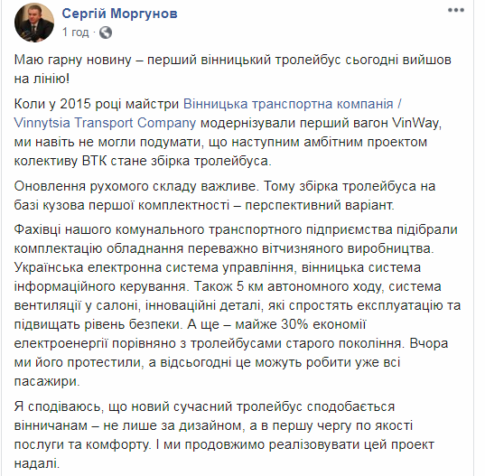 «Збірка тролейбуса на базі кузова першої комплектності – перспективний варіант.Фахівці нашого комунального транспортного підприємства підібрали комплектацію обладнання переважно вітчизняного виробництва. Українська електронна система управління, вінницька система інформаційного керування. Також 5 км автономного ходу, система вентиляції у салоні, інноваційні деталі, які спростять експлуатацію та підвищать рівень безпеки. А ще – майже 30% економії електроенергії порівняно з тролейбусами старого покоління. Вчора ми його протестили, а відсьогодні це можуть робити уже всі пасажири», - написав мер.