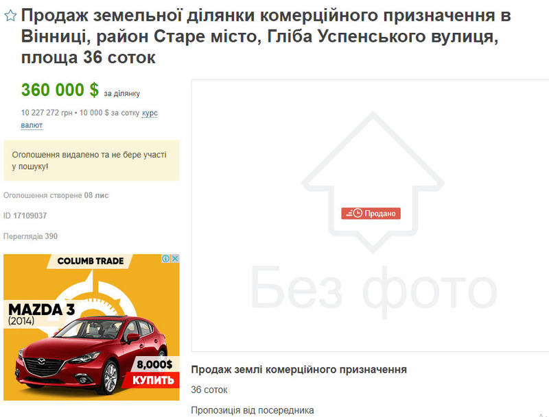 Хоча ріелтори наголошують, що для житлової забудови мають іншу ділянку - 19 соток за $350 тисяч на розі вулиць Магістрацької та Лесі Українки.
