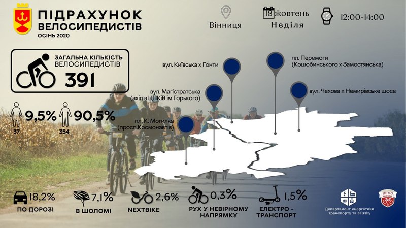 Вінницькою міською радою спільно з ГО «Вінниця Мобільна» у середині жовтня було проведено другий підрахунок кількості велосипедистів у Вінниці. На момент приходу осені велосипедистів у місті поменшало на 34%, що й не дивно, адже разом з осінню прийшли холоди й дощі.
