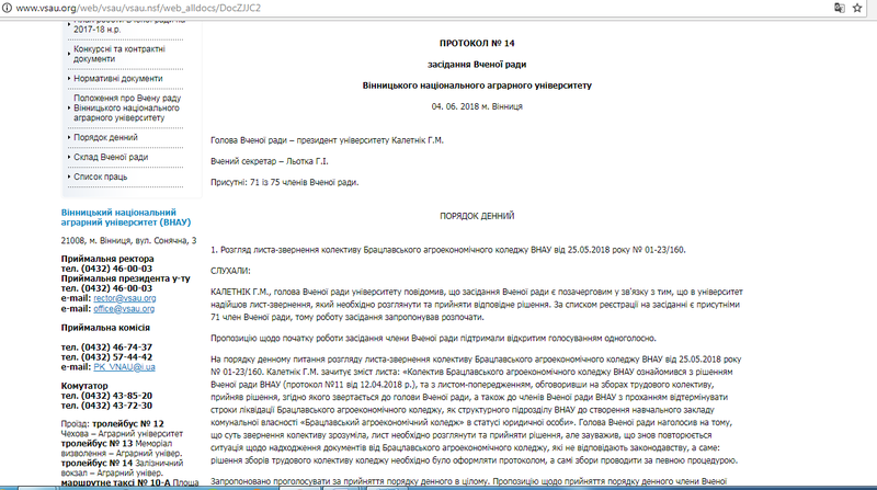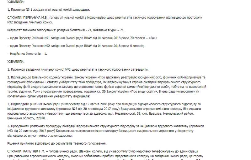 Відтак вчена рада Вінницького національного аграрного університету взагалі прийняла рішення про ліквідацію відокремленого структурного підрозділу (філії) Брацлавського агроекономічного коледжу ВНАУ.
