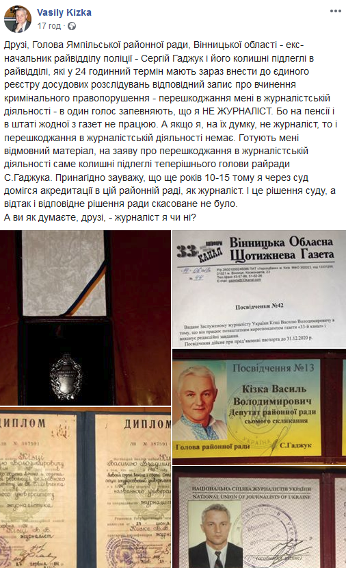 На своїй сторінці у Facebook Василь Кізка 4 грудня опублікував фото своїх документів, оскільки, за його словами, у місцевій поліції наполягали, що він – не журналіст, бо «не працює в жодній редакції».