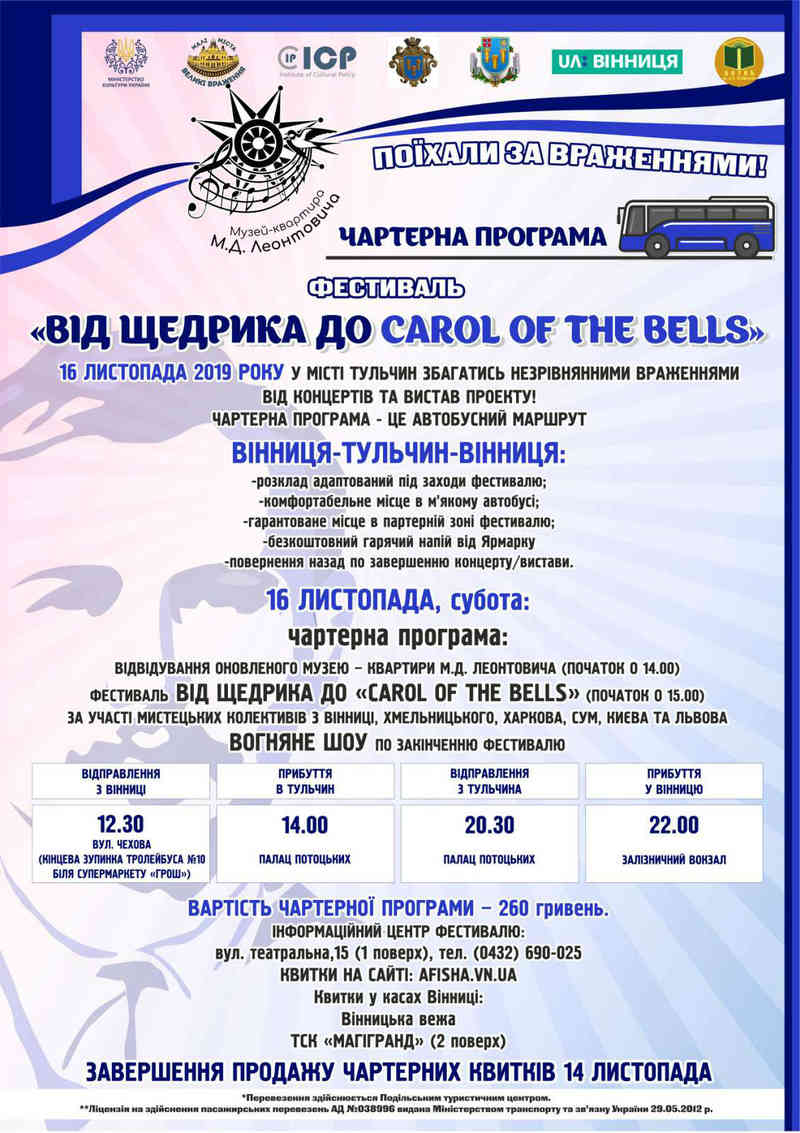 Також, для зручного відвідування фестивалю організатори запроваджують спеціальні чартерні програми - автобусний маршрут ВІННИЦЯ-ТУЛЬЧИН-ВІННИЦЯ.