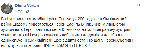 Сьогодні , 9 вересня, вдосвіта тіло військового доставлено додому .Про це на своїй сторінці у Facebook написала відома вінницька волонтерка Олена Верлан.