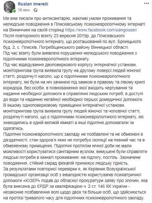 Розголосу «історія» із «внутрішньою кухнею» у закладі набула після того, як керівник Всеукраїнської громадської організації осіб з інвалідністю користувачів психіатричної допомоги «ЮЗЕР» Руслан Імереллі у Facebook написав про внесення в ЄРДР відомостей про злочин посадової особи.